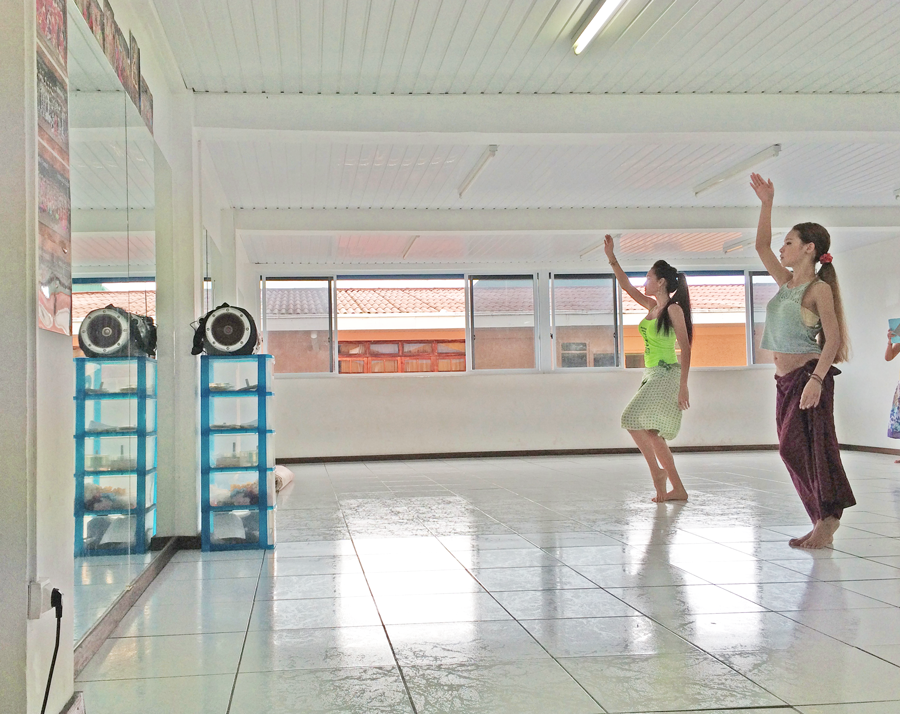 閑静な住宅街に位置するご自宅の横に設立された名門ダンススクールは、美しい山々と自然に囲まれた敷地内にあり、パンダナスなど自然素材を使用したポリネシア様式のスタジオです。